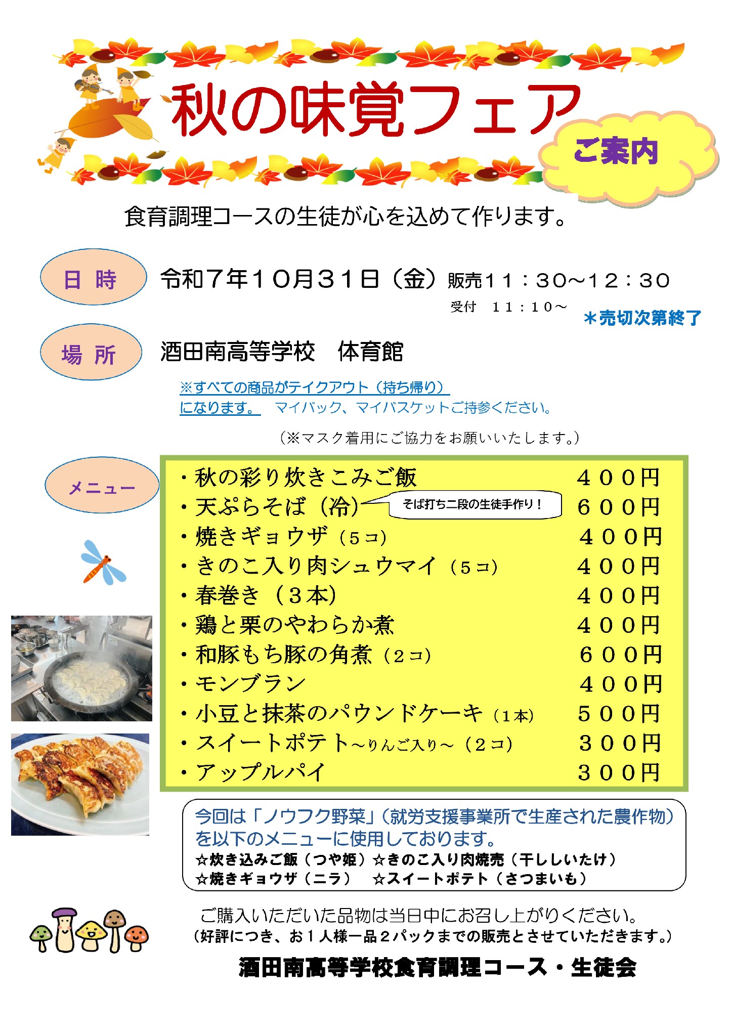 令和7年10月31日(金)に本校食育調理コースの生徒が「秋の味覚フェア」を開催いたします。※詳しくは下をご覧ください