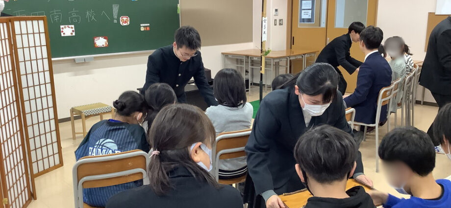 茶道部がお点前やお茶を点て、Sクラブがお菓子やお茶を運び、子どもたちに和菓子の食べ方や抹茶の飲み方(作法)を学んでもらい、交流を深めました。