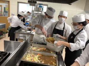 来年度は3年生になり給食実習を行うため生徒たちも真剣にスチームコンベクションオーブン(通称スチコン)を学んでいました。できあがった料理を試食して美味しくかつ効率的に作ることができるスチコンに驚き、感心していました。